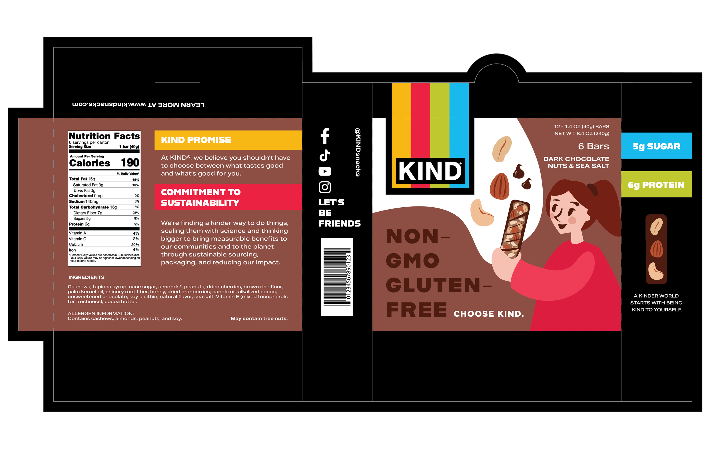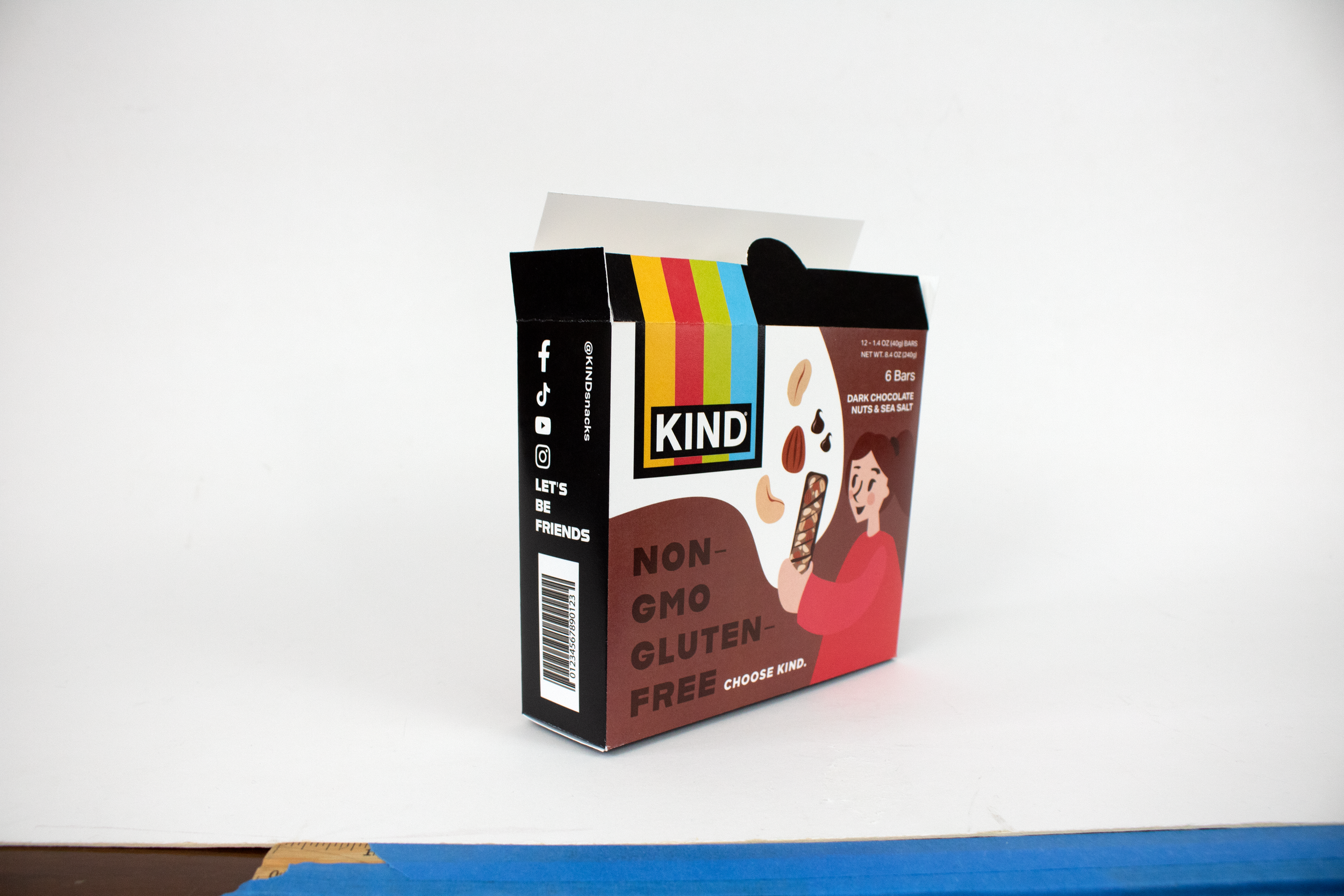 The goal of this redesign is to emphasize KIND’s commitment to sustainability and nourishing ingredients because their current design does not communicate these essential brand values. The goal was to give the packaging a natural feel, but also combine this with KIND’s current bold, bright visual brand. These visual aesthetics are often contradictory, but the challenge was to combine the two to create a cohesive design.
