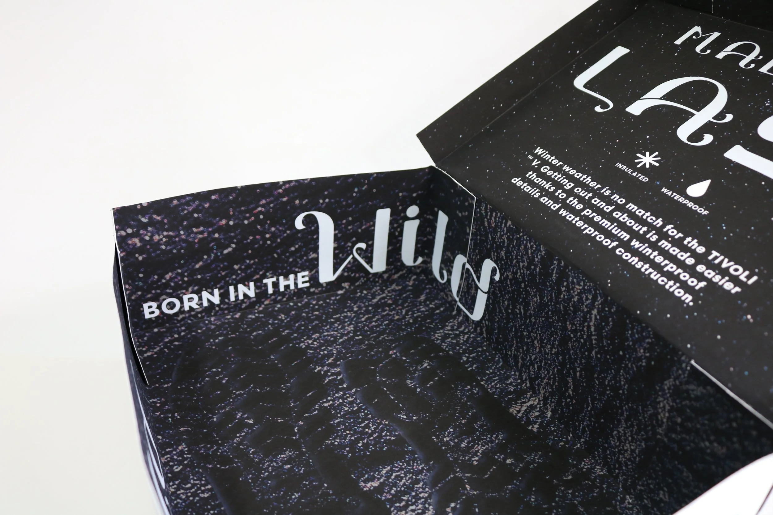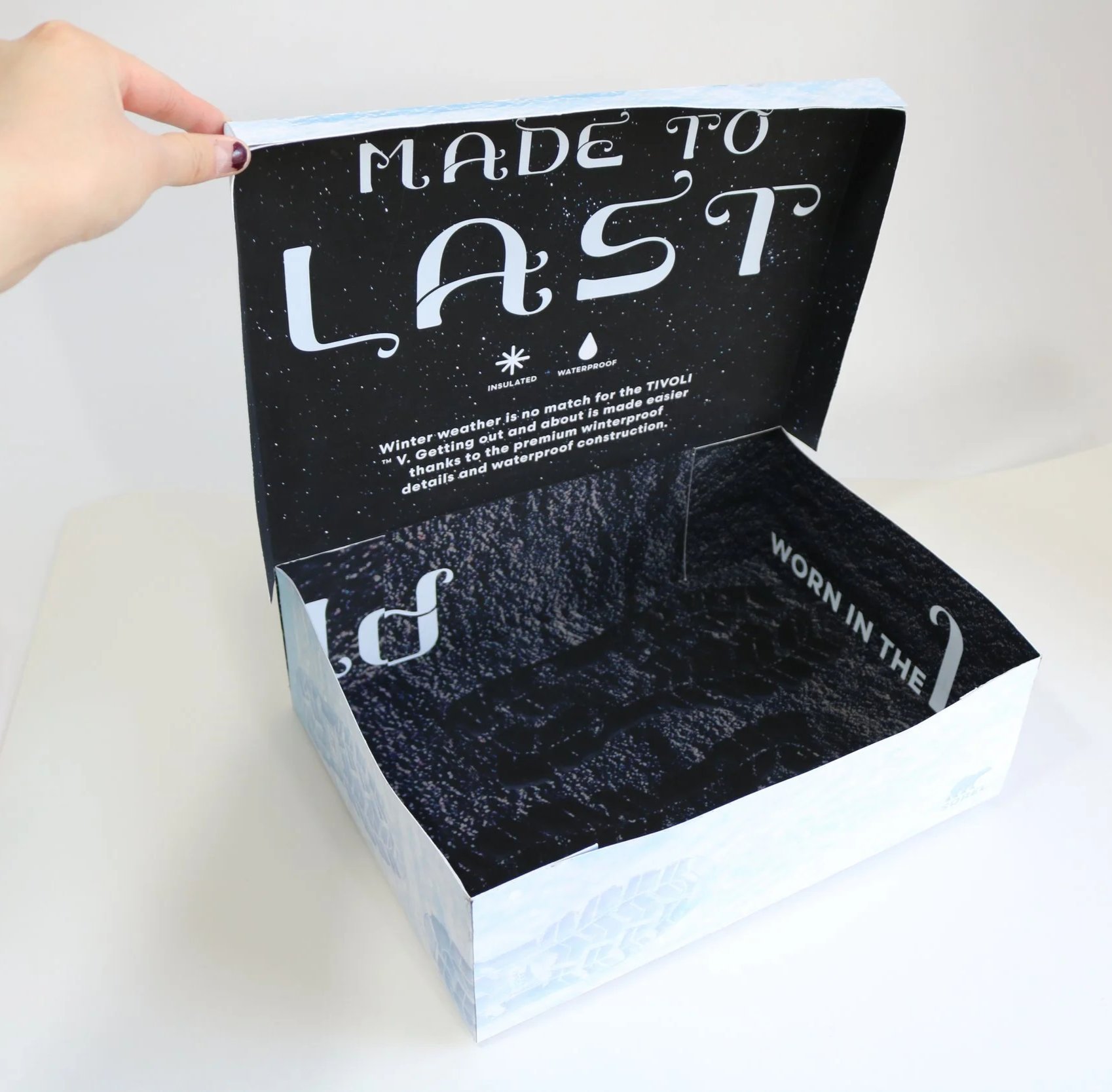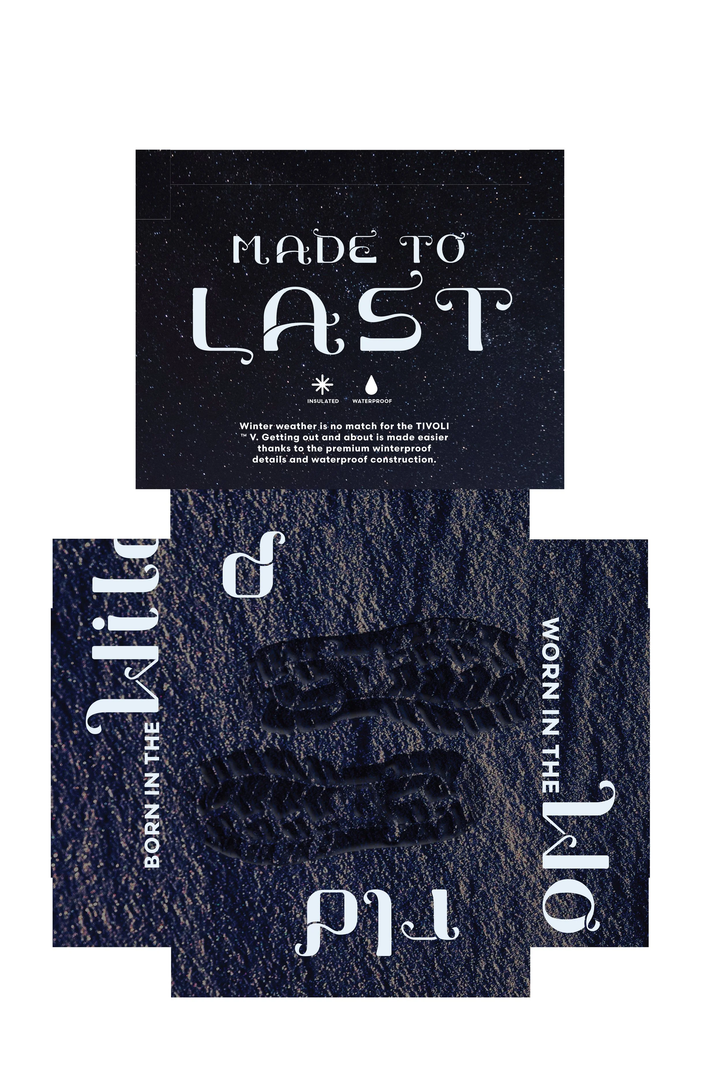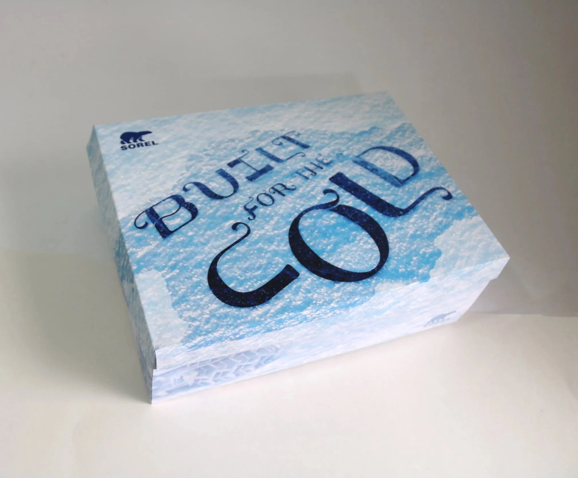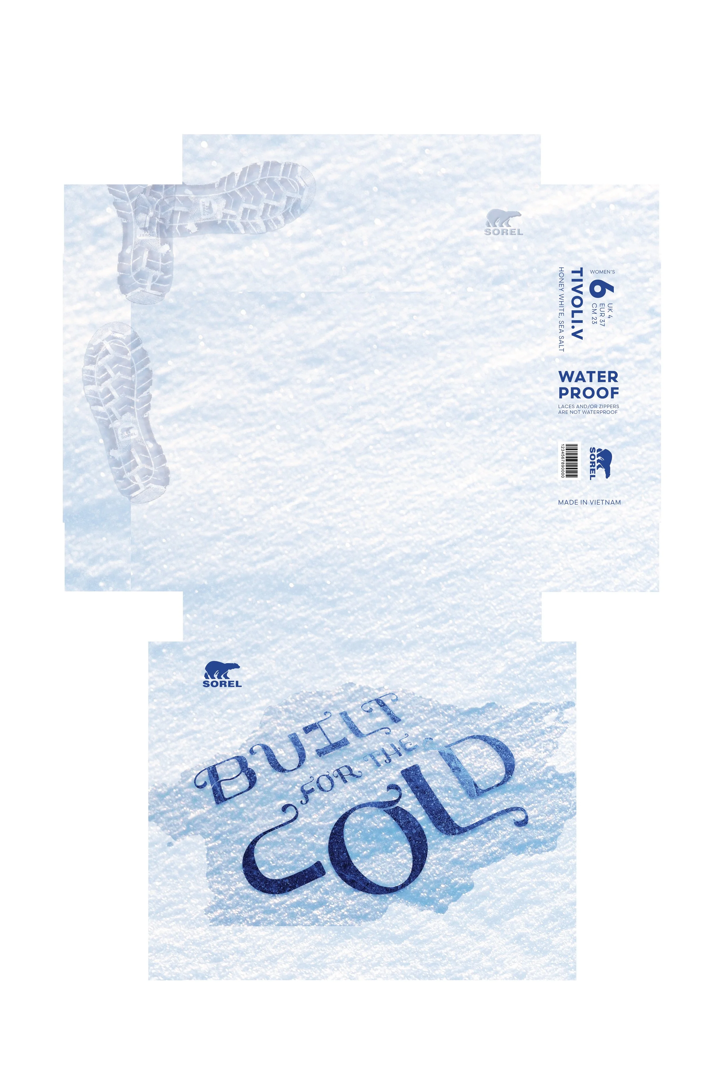 This shoebox re-imagines Sorel’s box design, emphasizing the brand history that is rooted in nature. The design pulls inspiration from Sorel’s iconic boots that are made to last in cold weather and snow. The poster design follows this same concept, creating an eye-catching poster with an icy feel, communicating the durability and quality of Sorel’s.